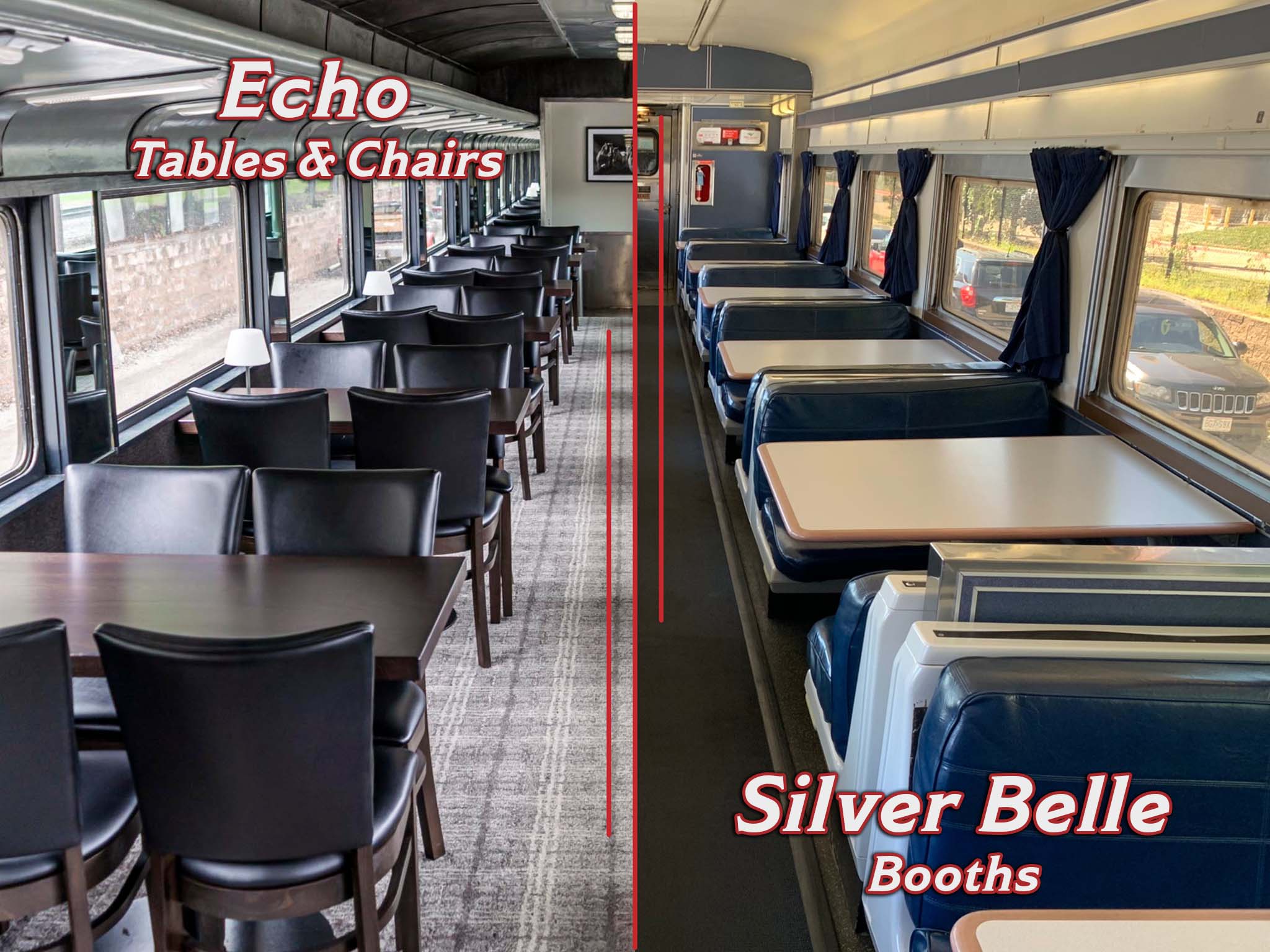 Our Deluxe Coach Class cars feature tables and chairs (Echo), comfortable booth seating (Silver Belle), or both (Silver Lake). Seats must be purchased in sets of two and guests might share a table with other passengers on busy trains if they do not purchase all four seats.